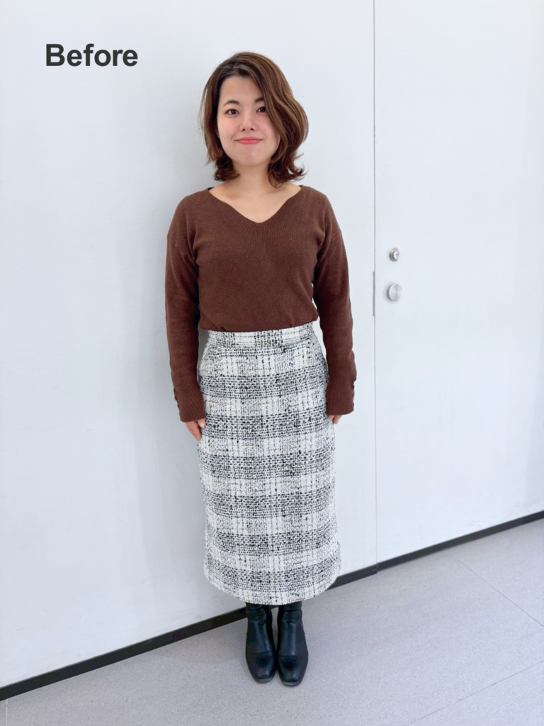 骨格はストレートとのことと、下半身が気になるとのお悩みに合わせて全体的に広がりすぎず、体のラインがスッキリ見えるコーディネートに。後日、購入したお洋服を別のイベント登壇の際にお召しになられたそうで、来場者より「オーラがある方」と言われたそう。大変喜んでいらっしゃいました。
